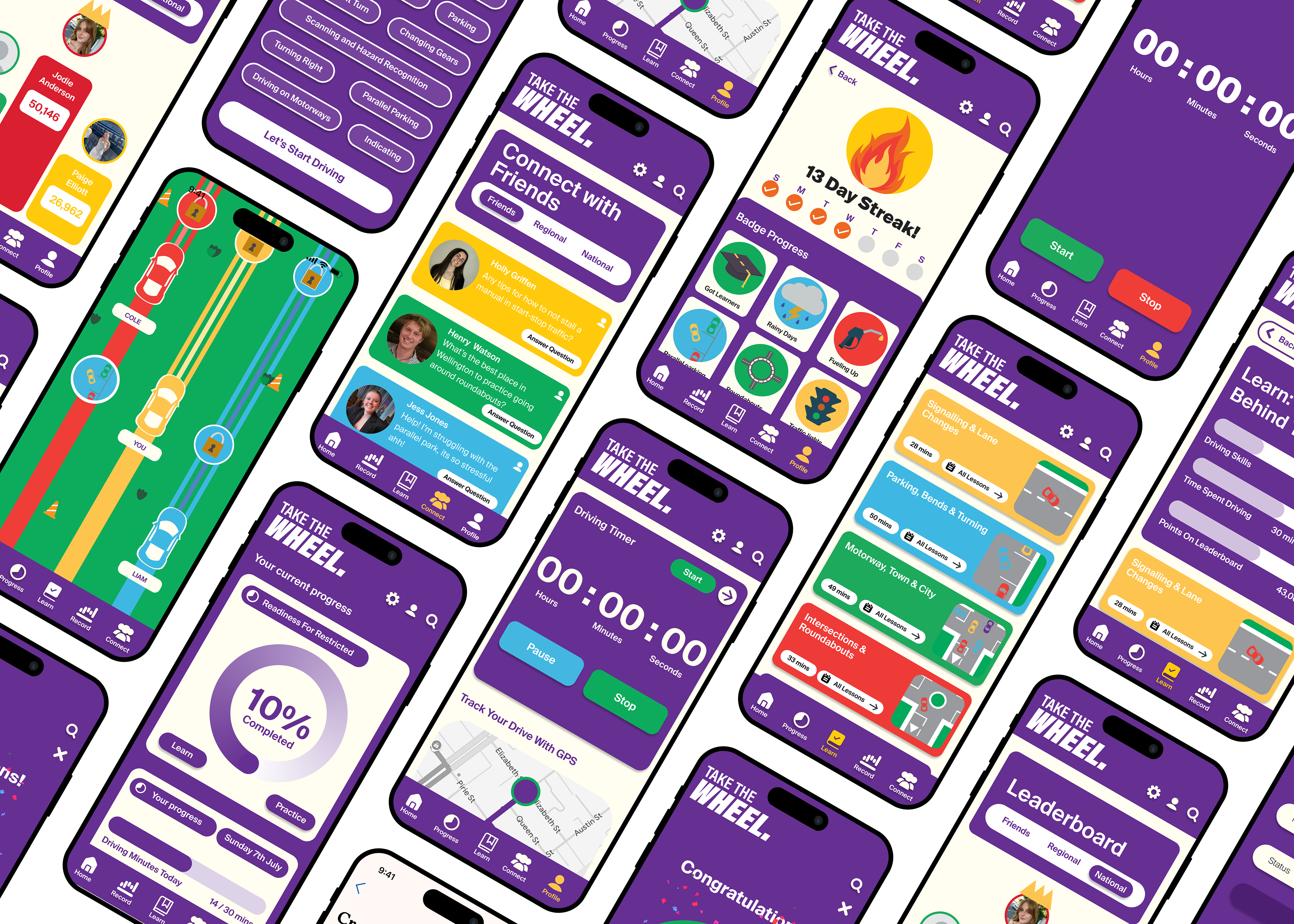 Take the Wheel was designed to help young New Zealanders become confident drivers through the creation of a fun and engaging Progress Tracker app. Designed for teens who feel anxious or unsure about how to start learning, the app lets users track their driving hours, earn rewards, and access interactive games and learning tools.